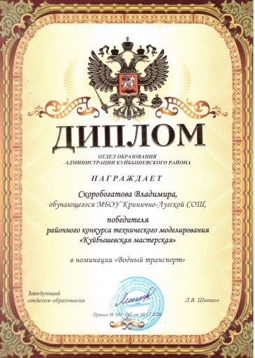 Работа Скоробогатова Владимира «Речной тихоход» стала победителем в своей номинации. Владимир награжден дипломом Отдела образования и ценным подарком.