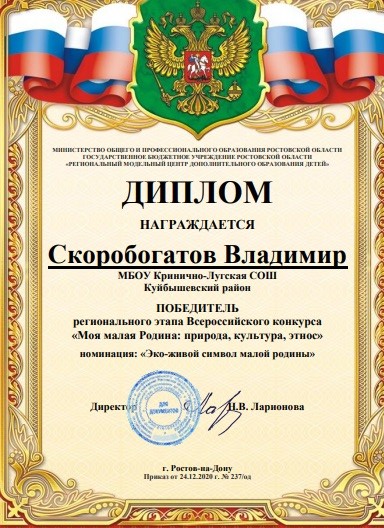 «Хозяин лугов» - под таким названием работа, выполненная обучающимся 6 класса Скоробогатовым Владимиром, была представлена на региональный этап Всероссийского конкурса «Моя малая Родина: природа, культура, этнос».