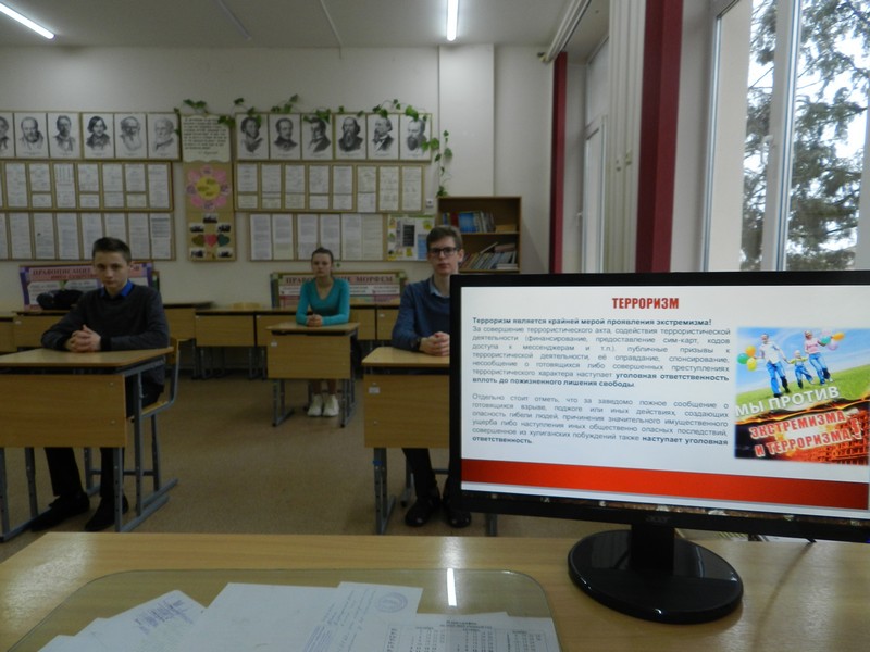 В целях недопущения проникновения в молодёжную среду националистических и экстремистских идей во всех классах школы прошли классные часы на тему «Экстремизму-нет!» Классные руководители акцентировали внимание обучающихся на том, что Россия многонациональное государство, более 200 национальностей на территориях современной Российской Федерации проживает в мире и согласии, понимая сложившиеся в обществе традиции и обычаи различных этносов и представителей религиозных сословий.