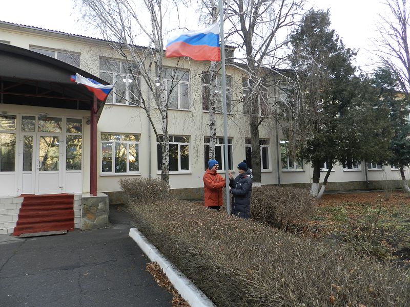 Начался день с поднятия флага России. Сегодня право поднять флаг было предоставлено призёрам муниципального конкурса «Жить здорово!» Билому Алексею и Задорожнему Никите.