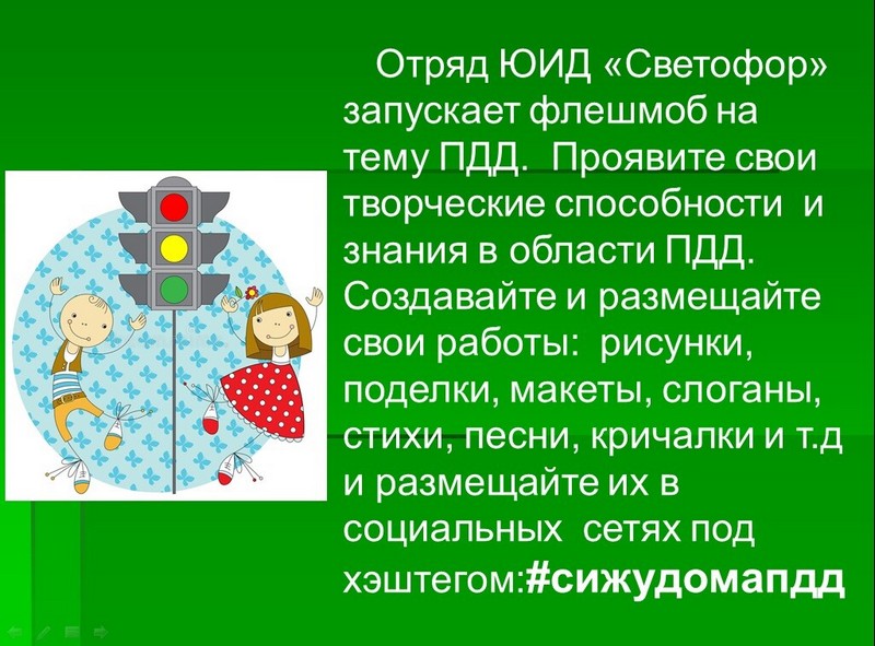 Отряд ЮИД «Светофор» запустил флешмоб на тему ПДД. Предложили проявить свои творческие способности и знания в области ПДД. Создавать и размещать свои работы: рисунки, поделки, макеты, слоганы, записывать песни, призывы, кричалки и т.д. и размещать их на своих страницах в соцсетях с хэштегом :#сижудомапдд.