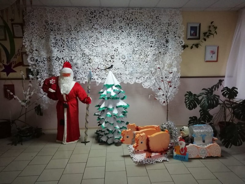 Переступив порог нашей школы, сразу попадаешь в сказку. Всеми любимый Дед Мороз встречает всех гостей и хозяев у входа вместе со Снегурочкой-свинкой.